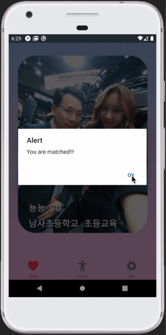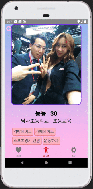카드를 넘기면서 좋아요 or 싫어요를 선택하고, 상호간에 좋아요가 성립이 되면 채팅창이 생성된다!
