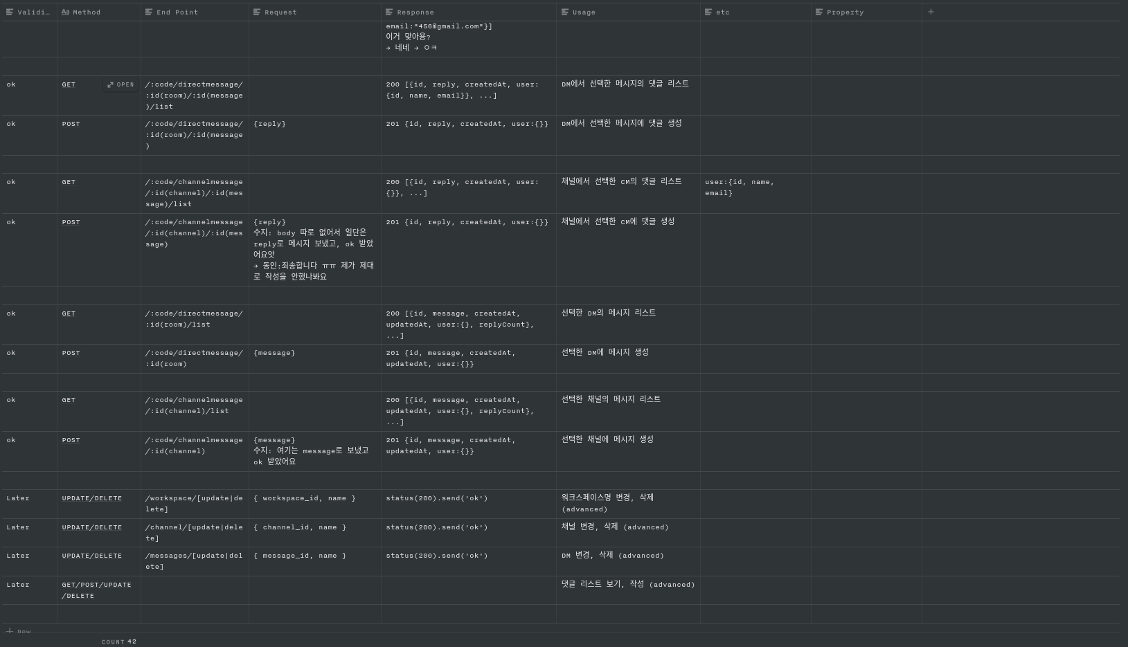지금은 내용이 많이 들어있지만 처음에는 빈칸으로 있었고 회의를 통해 필요한 것을 요청하고 API가 만들어지면 문서에 작성하여 프론트파트는 그것을 참고하여 서버에 요청을 하였다.