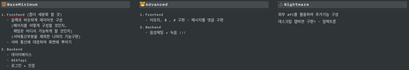 Bare Minimum으로 Slack 클로닝, Advanced로 discord기능 얹기로하고 프로젝트를 진행하였다.